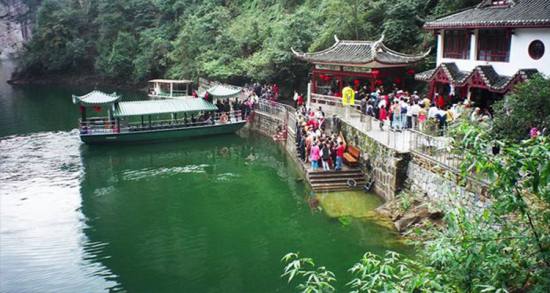 寶峰湖是一個(gè)截流筑壩而成 的人工湖,以其秀麗的湖光 水色與幽野的洞天情趣成為武陵源水景風(fēng)光的代表之 作。湖中有兩座疊翠小島,近岸奇峰屹立,峰回水轉(zhuǎn)?!》褐勐?,只見一湖綠水半湖倒影,充滿詩情畫意?!霸铺萑f丈上天臺(tái),高峽平湖一鑒開,王母瑤池金扶,浣沙仙女下凡來”游寶峰湖,你就會(huì)欣賞到這樣的詩情畫意。群峰擁抱的寶峰湖,它本是人工修建的一座多功能的水庫,能截留蓄水,灌溉農(nóng)田、養(yǎng)魚、發(fā)電、 游覽。它“遠(yuǎn)看是高峽,近看不見壩,上梯七十米,平湖住船家?!焙q如一面寶鏡,四面青山,一泓碧水,蕩槳溫游,格外愜意。坐在船上,環(huán)顧四周,千山聳翠,俯視水中,倒影慢移,碧水照相館得群峰綠,人面桃花水映紅。真是靜極了,美極了!在湖中漫游,還可以見到湖心島上的一些佳景,如“玉瓶開花”、“十女梳妝”、“金魚戲水”、“青娃鬧春”等等,也各有特色。鷹窩寨 為寶峰公園一景,進(jìn)公園后西向登山數(shù)百石級(jí),頭頂?shù)氖辶芽p如線,入口處有古城門雉堞,盡處有寶峰古寺,香火旺盛。崖上石徑直上峰 頂,相傳舊社會(huì)有匪首如鷹盤踞山頂小寨。一線天 是寶峰公園的一大絕景?!{谷長(zhǎng) 200余米,高100余米,平均寬度不足兩米,中有小溪, 溪畔石級(jí)盤旋而上,清幽無比,曲奧無窮。